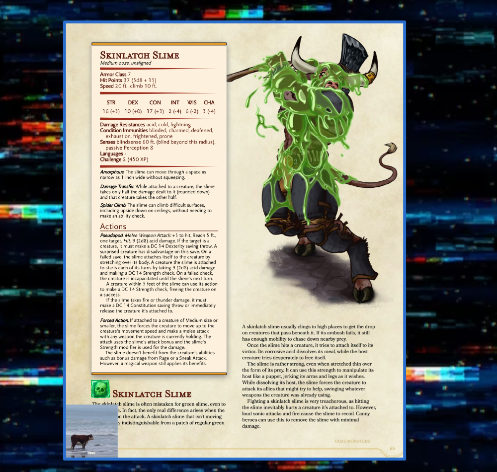 І тут ми йдемо вже одразу до того що нас цікавитиме найбільше, це 1970-ті цей період зароджується Dungeons & Dragons не думаю що варто предсталяти цю легендарну і воістину величну настілку, яка подарувала настільки великий і насичений світ, з якого надихаються і по сьогодні, вклад в ігрову індустрію цього проєкту важко переоцінити, це як що ну дуже коротко, але нас цікавить слиз, желєха різнобарвна. ось тут вже починається.