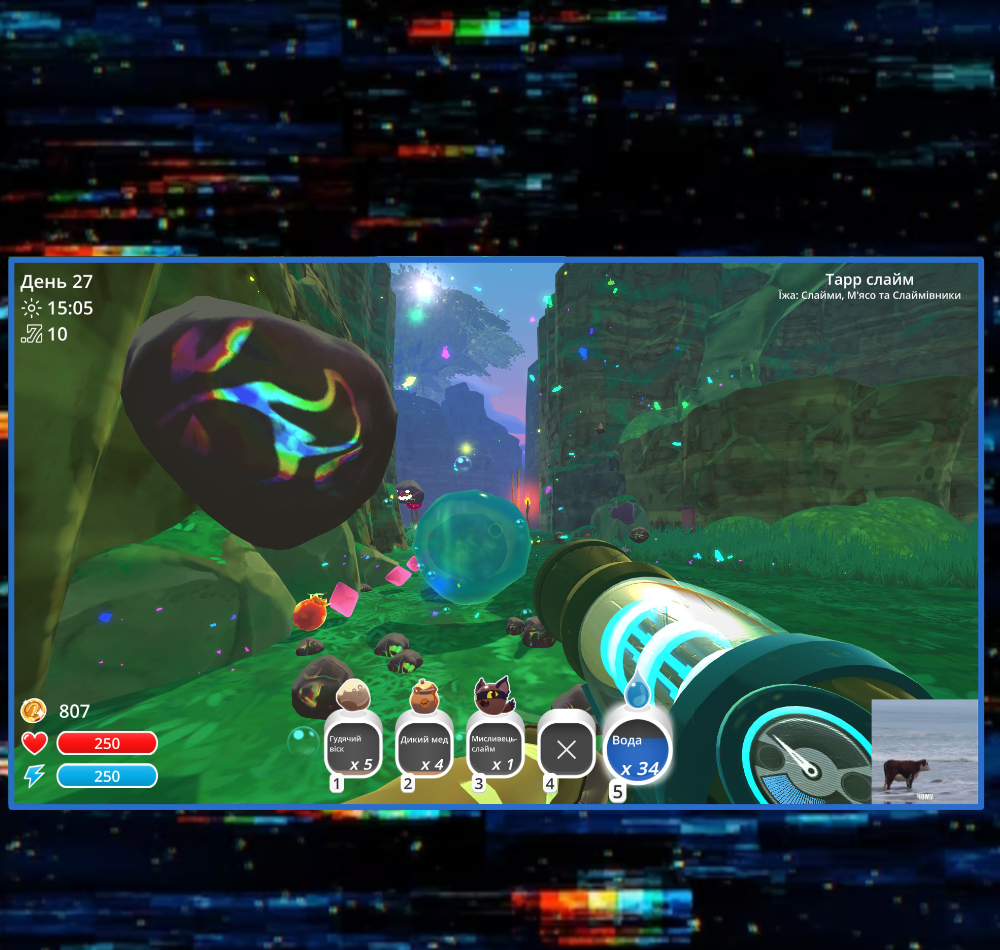 Ми потрапляємо на ранчо слаймів, все таке в домашніх тонах, немає гострих кутів, музичка розслаблююча, в руках якийсь дивний пристрій, який виявляється працює як якийсь пилосмок який перероблений під гвинтівку, дуже нагадує гравіцапу з Half Life.