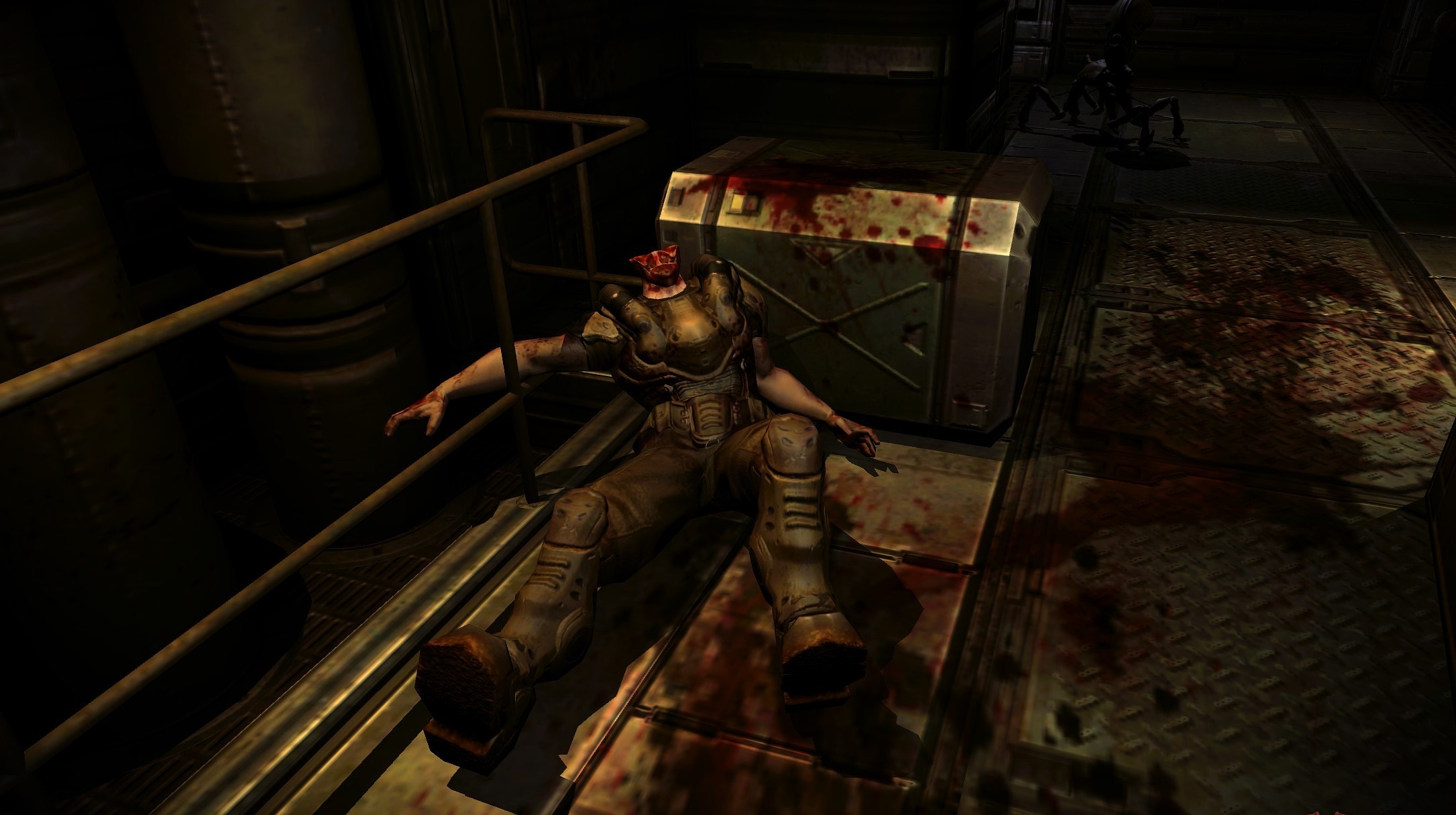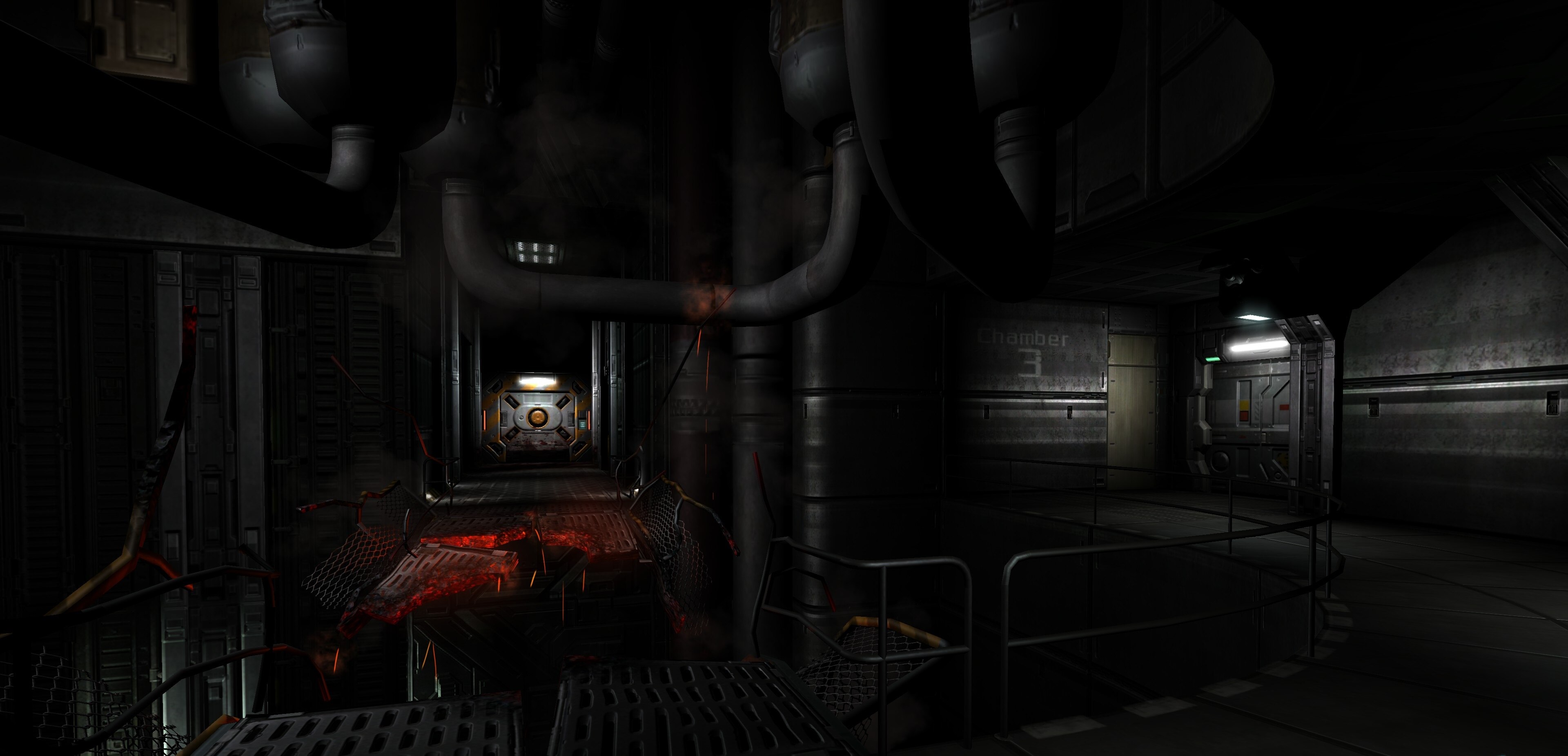 Ось ви чуєте надривний звук сирени, проходите коридором трохи далі та натрапляєте на вентиляційну шахту, з якої раптом виривається стовп пари. Робите ще кілька кроків і помічаєте, що вже чавкаєте ногами по якійсь кривавій, плотській субстанції. Озираєтеся довкола й продовжуєте рух до зали керування, і тут раптом лунає вже знайоме гуркотіння ворожої істоти, яка тільки й чекає на вашу появу.