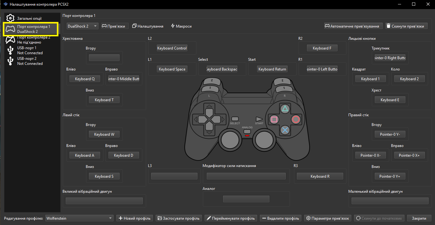 Якщо в тебе є геймпад — клацай по полю, куди треба призначити кнопку, а потім натисни потрібну кнопку на геймпаді. З клавіатурою — те саме: клацнув поле, натиснув клавішу.