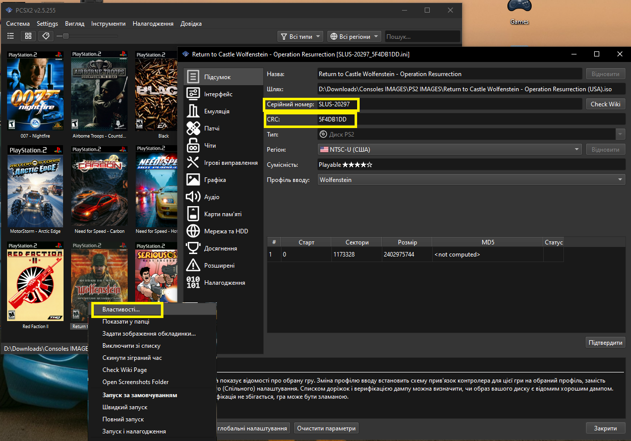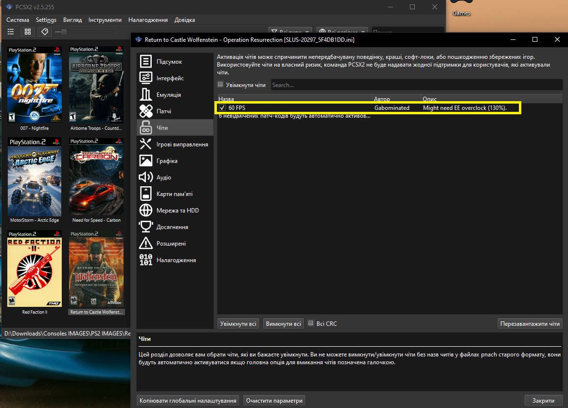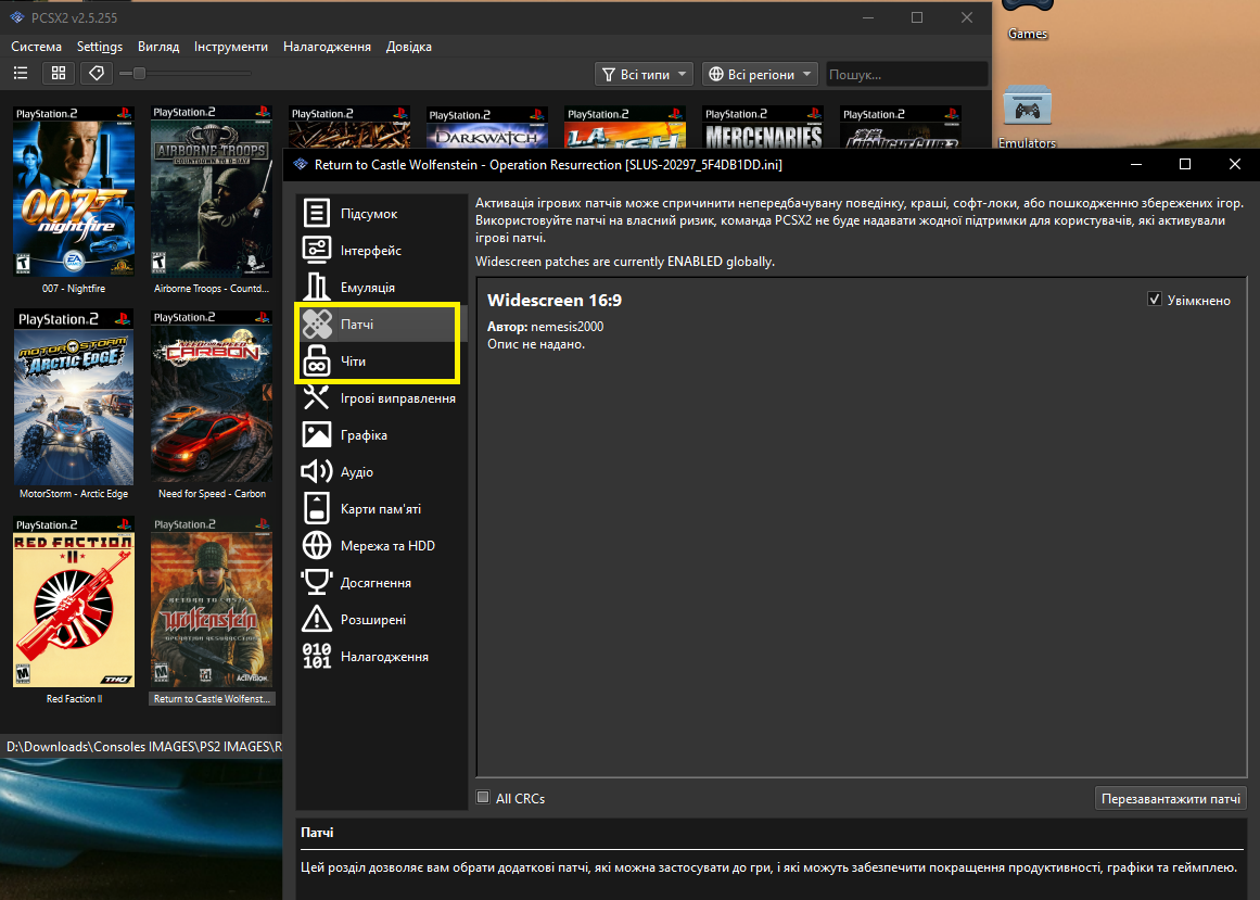 У випадку вибраної гри для демонстрації (Wolfenstein), патч буде зватися 5F4DB1DD.pnach