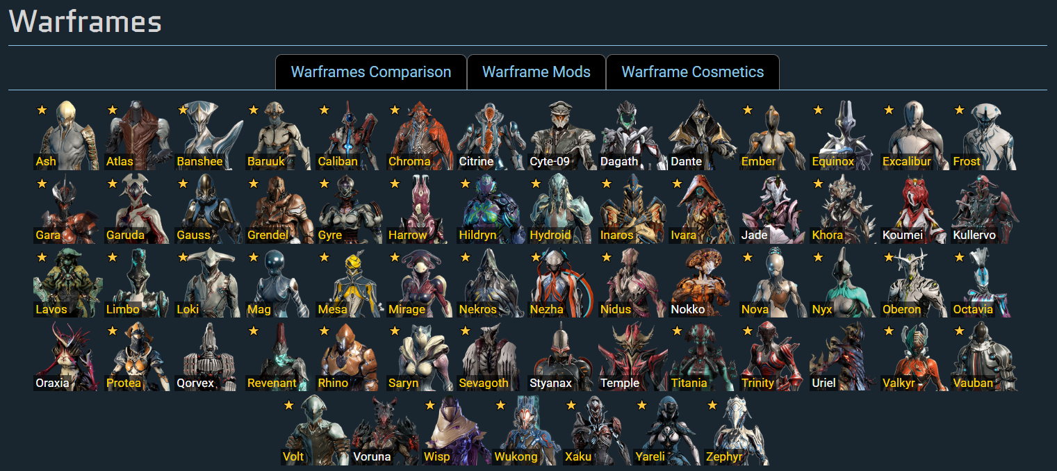 Ворфрейм — це не просто костюм, а повноцінний ігровий “клас”, аналог героя з MOBA-ігор. На момент написання в грі налічується 113 ворфреймів, з яких 63 є унікальними, а решта — їхні варіації зі зміненими характеристиками. Перед кожною місією гравець може повністю змінити спорядження, насамперед обраний ворфрейм, кожен із яких має: