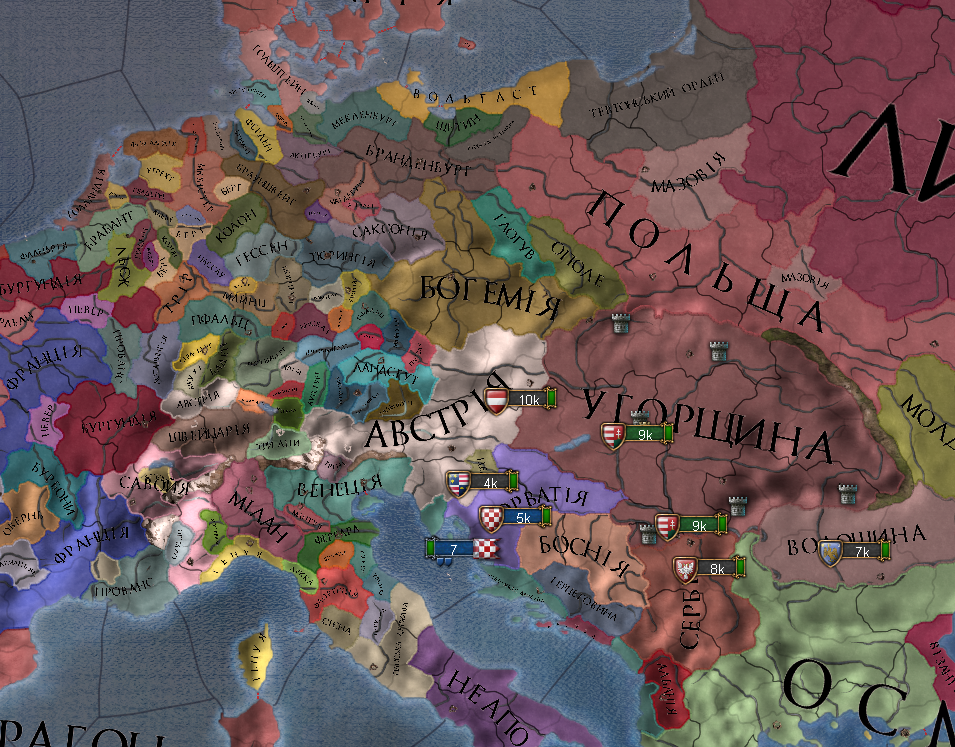 Якщо обрана країна перебуває в стані війни, можна побачити активні фортеці її суперника, навколо яких будуть червоні штрихи.