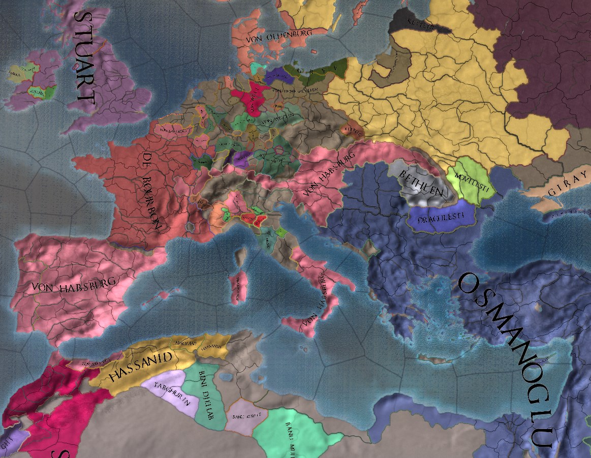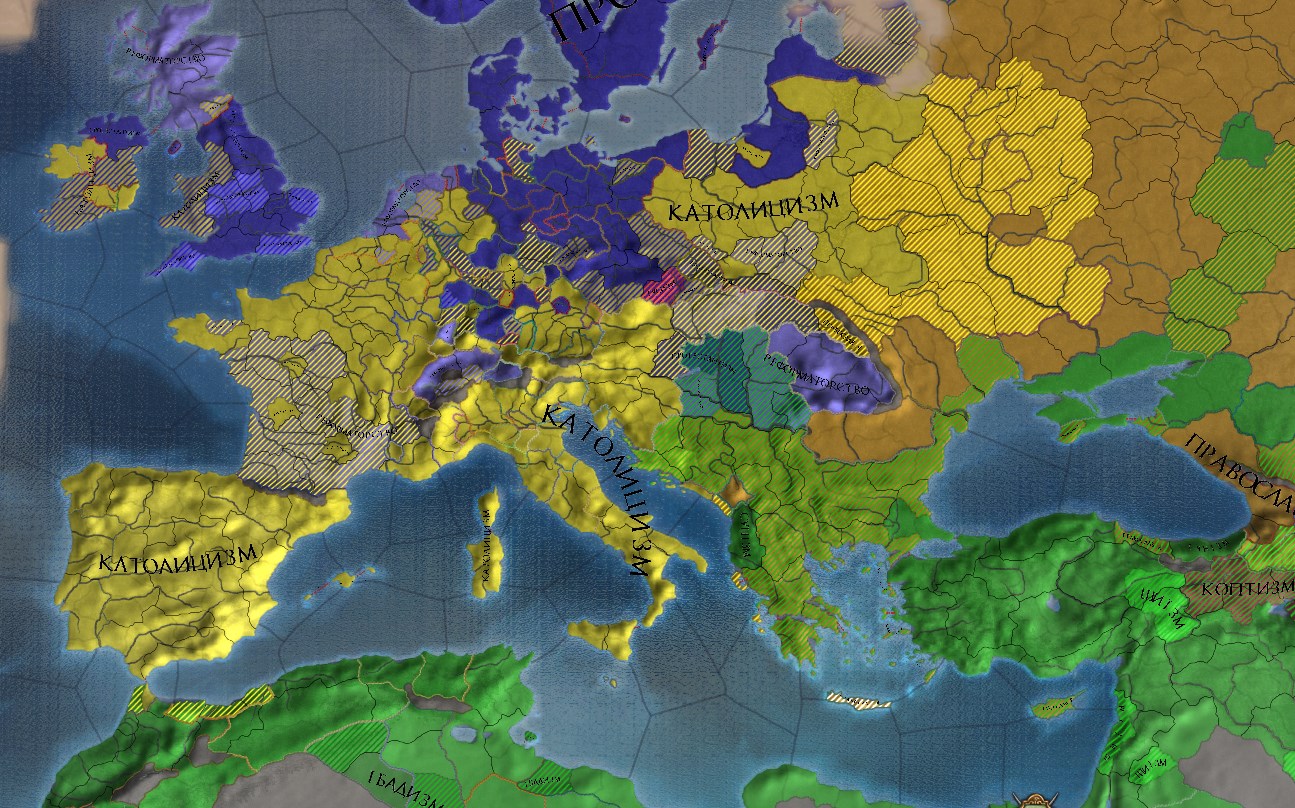 Якщо державна релігія не представлена в провінції, то вона буде помічена пунктиром, колір якого відповідає державній релігії (як приклад, державна релігія Франції католицизм, але ряд провінцій протестантські, через що вони заштриховані жовтим. Ряд провінцій османів на Балканах мають відміну віру від державної, вони теж помічені пунктиром. Це стосується всіх держав).
