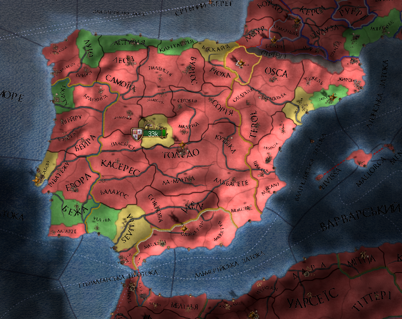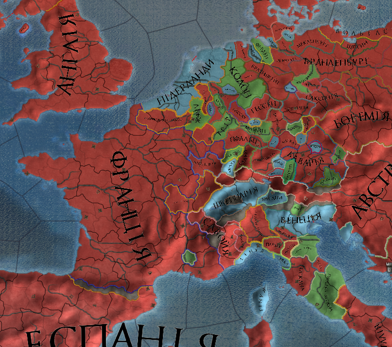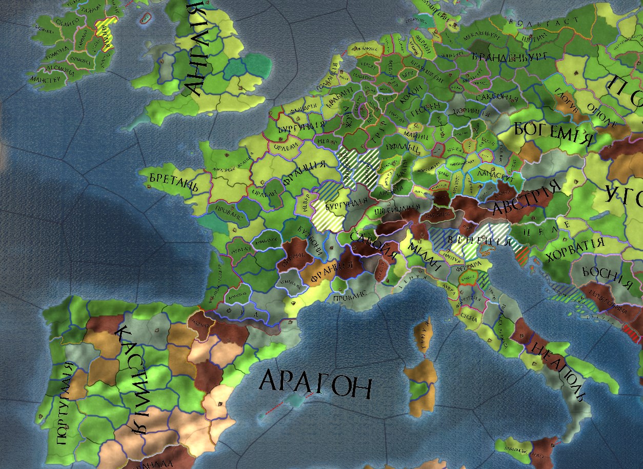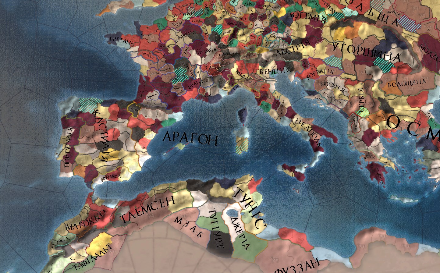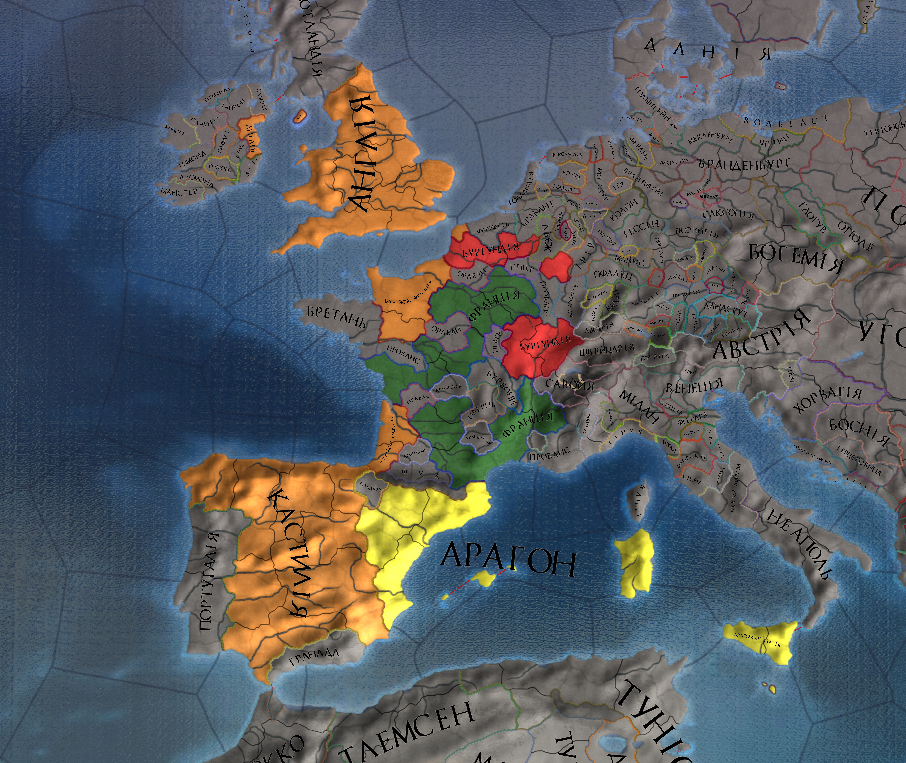 Яскраво оранжевий колір – наявне агресивне розширення в достатній кількості, держава може з великим шансом вступити в коаліцію (Еспанія).