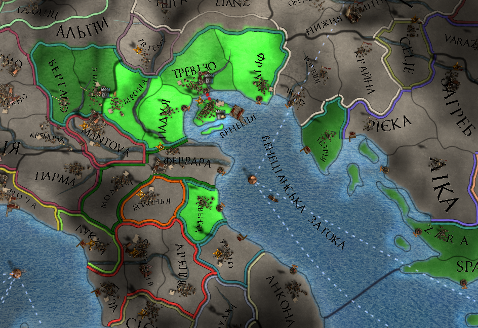 Чорний з зеленим штрихуванням навколо – фортеця є в провінції та вона активована. Зелені штрихи показують провінції, які перебувають під контролем фортеці. Якщо фортеці створюють цільну лінію як в Кастилії, то ворожі війська не зможуть пройти не окупувавши фортеці.