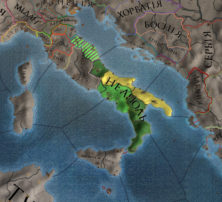 Заштриховано зеленим на зеленому – провінція була захоплена, але навіть не почала націоналізуватися державою.